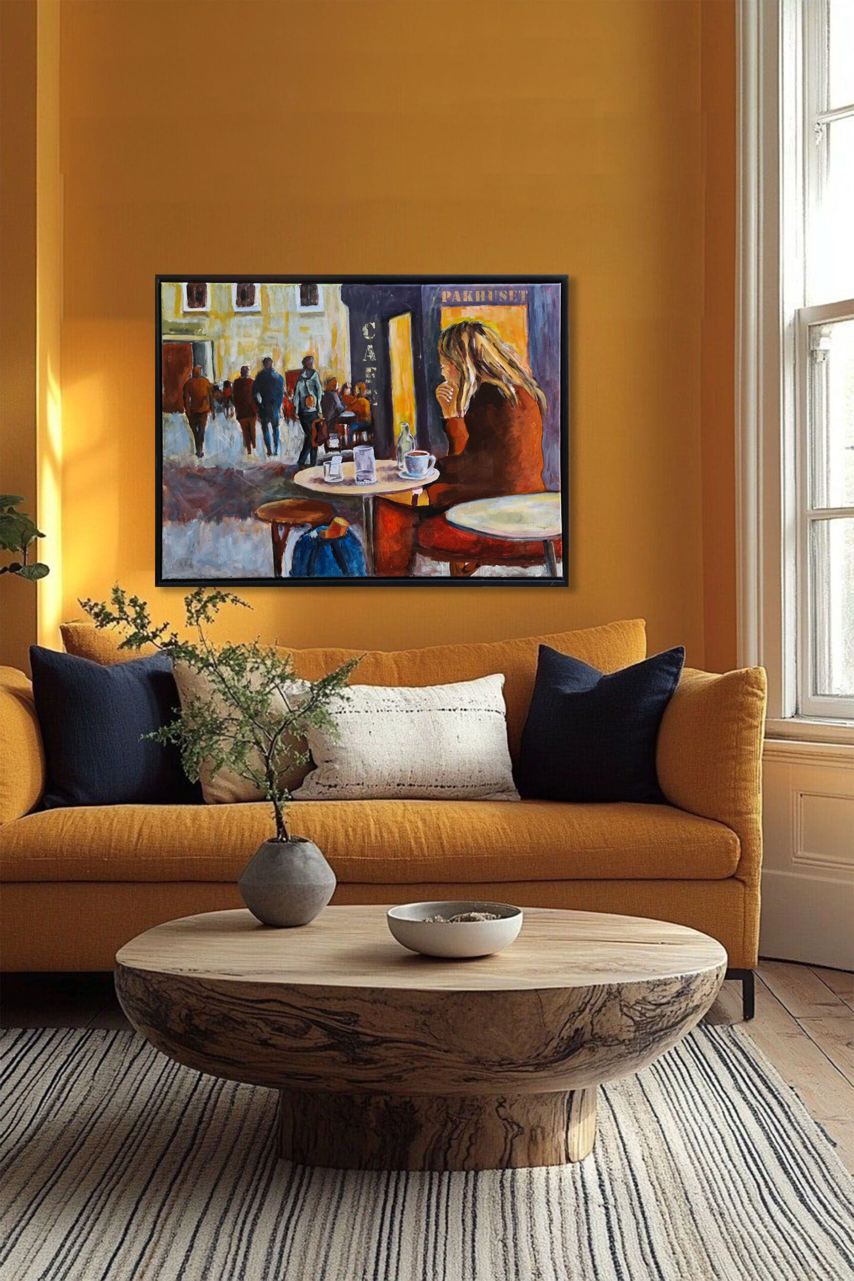 Website about Rask ART Art – Paintings – Stencils / street art News Lonely girl at cafe dreams of becoming part of the community of young people having a good times To see painting full size Look